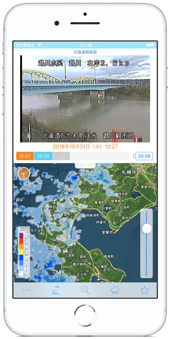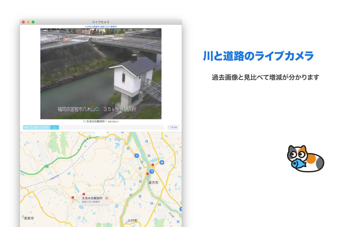 国土交通省や自治体が設置している川や道路のライブカメラ画像と水位情報、および気象庁提供の雨雲レーダー画像をご覧になれます。