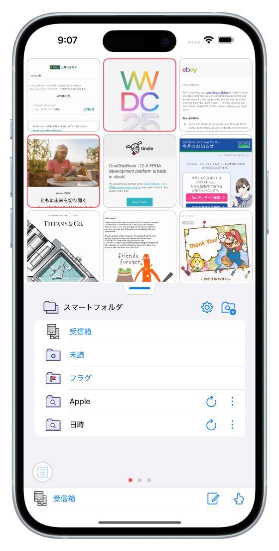 メールアプリです。メールの受信と送信ができます。メールをサムネイルで一覧できるのが特徴です。受信は IMAP と POP に対応しています。